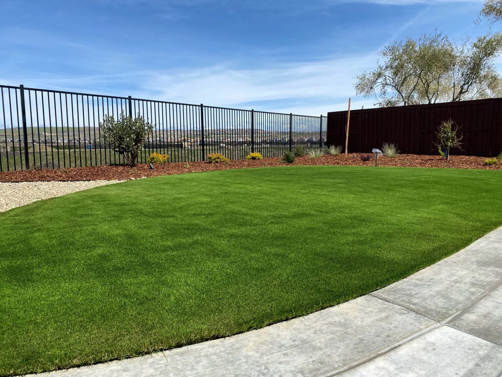 Premium Tahoe 140 oz turf delivers a thick, manicured backyard lawn with a clean fence-line edge — drought-friendly and green year-round.